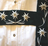 Die Edelweißhosenträger sind reine Handarbeit aus grünem Tuchstoff. Sie werden vor dem zusammennähen gestickt und am Rand mit einer Zackenschere geschnitten. Der steife Futterstoff gibt den nötigen Halt. Sie haben eine Schnalle mit einem Gummi für die Beweglichkeit und sollen 8 cm vorne am Bund über die Hose ragen.